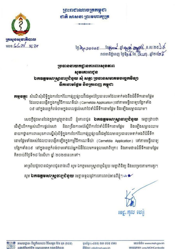 សមាគមបច្ចេកវិទ្យា ទឹកនោមផ្អែម និងក្រពេញកម្ពុជា បានប្រគល់សិទ្ធិជូននាយកដ្ឋានការពារសុខភាព នៃក្រសួងសុខាភិបាល បានចែករំលែក និងផ្សព្វផ្សាយវីដេអូអប់រំទាក់ទងនឹងជំងឺទឹកនោមផ្អែម ដែលបានបង្កើតឡើងដោយក្រុមការងារកម្មវិធីទូរសព្ទ «កំណត់ត្រាទឹកនោមផ្អែម CarnetDia » នៅតាមមន្ទីរពេទ្យបង្អែកទាំង០៩ ក្នុងខេត្តកំពង់ចាម ក៏ដូចជាតាមមន្ទីរពេទ្យបង្អែកដទៃទៀតនៅក្នុងព្រះរាជាណាចក្រកម្ពុជា។